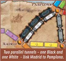 - Tunnlar: Man kan ta genvägar genom Europas berg, men det finns risker. Varje gång du spelar kort för en tunnel, visar du de översta tre korten i kortleken och för varje som matchar färg på de du precis spelade måste du betala ytterligare ett kort, annars måste du passa