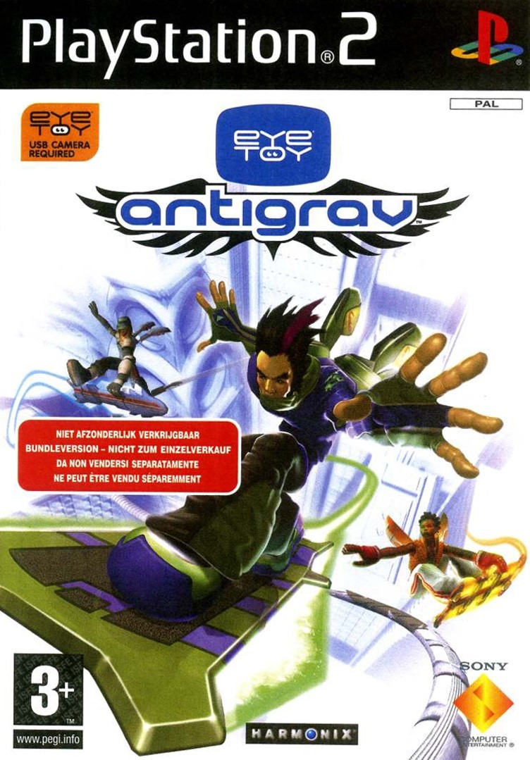 EyeToy: AntiGrav combines over-the-top boarding of an extreme sports game with the physical interaction of a dancing sim. Designed specifically for use with the EyeToy USB camera accessory, the game has players controlling their onscreen hover-boarder with their own body movements. Eight different characters are available and races take place in eight varied environments, each with multiple paths and shortcuts. Skilled performances unlock new items, upgrades, and additional playable characters. AntiGrav was developed by Harmonix, a studio that demonstrated its talent for creating unconventional on-rails gameplay with the critically acclaimed Frequency and Amplitude.