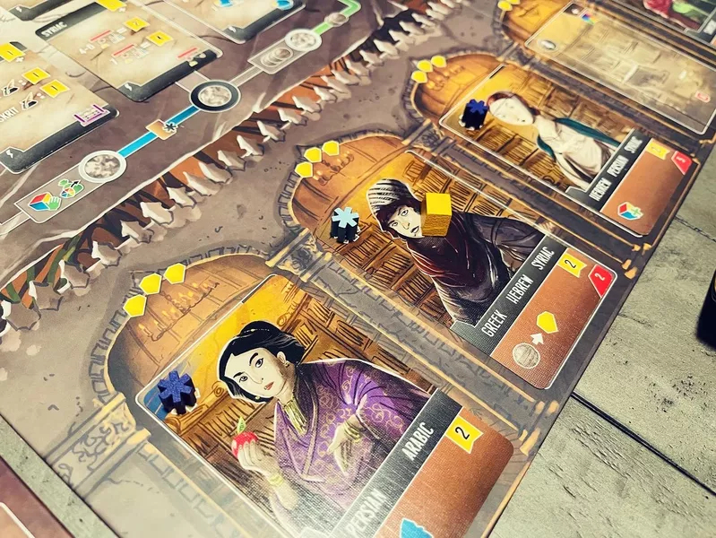 The aim of Scholars of the South Tigris is to be the player with the most victory points (VP) at the game?s end. Points are gained by translating scrolls, increasing knowledge in various areas of science and mathematics, influencing the 3 guilds, and by retiring translators after their years of faithful service. The game end is triggered once all 4 caliph cards have been revealed.