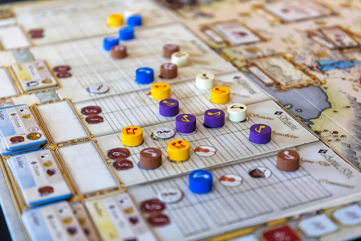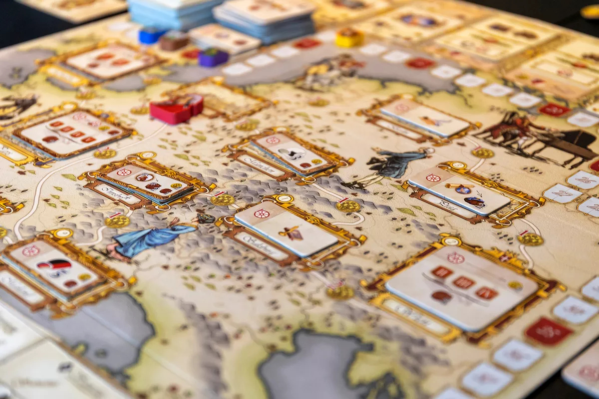 In Lacrimosa, players take the roles of patrons of the late musician, contributing with their fundings to the composers works one last time. During the game, you play in two different timelines: the present and the past. In the present, you commission the missing parts of the Requiem from other composers in order to complete it. When developing past events, the game takes place in five epochs in which you contribute by buying new compositions from the composer to sell or exhibit, accompany him on the different journeys through the main courts and theaters in Europe, and gather the resources you need in order to support the musician during his career.
