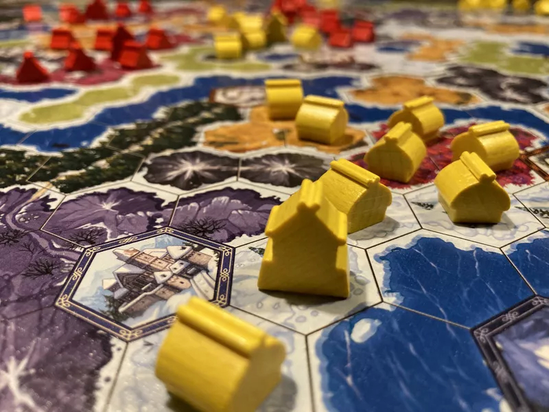 On your turn, you must place three houses in the terrain depicted on your terrain card. If possible, you must place the houses next to previously placed houses. (If not possible, they may be placed anywhere that matches the terrain on the card.) You also start the game with a limited number of forts, which can replace any house and which count as two pieces.