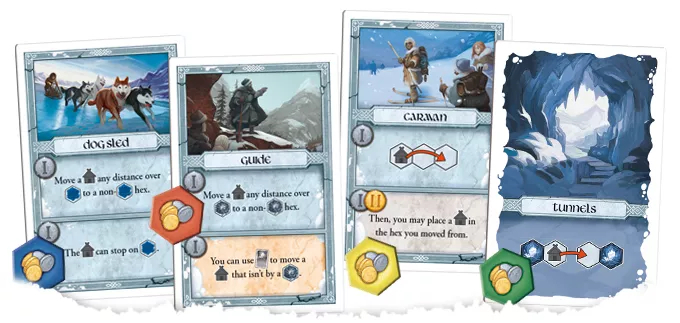 After placing houses, you may use your gold to make one purchase, either paying the cost to put one ability card into play or paying an additional cost on a previously placed ability to upgrade it. Once purchased, the ability may be used once per turn for the rest of the game. You start the game with a little gold to buy abilities and can earn more gold based on the economy card in play for that game.