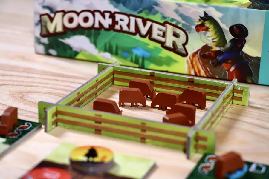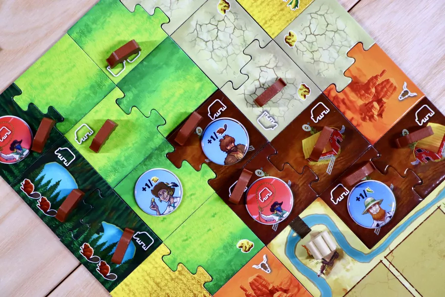 Instead of building your landscape around a central castle, you start from the river and expand away from it. Also, the crowns (i.e., the victory point multiplier) from Kingdomino are replaced by cow meeples, with players being able to use cowboys to move them.