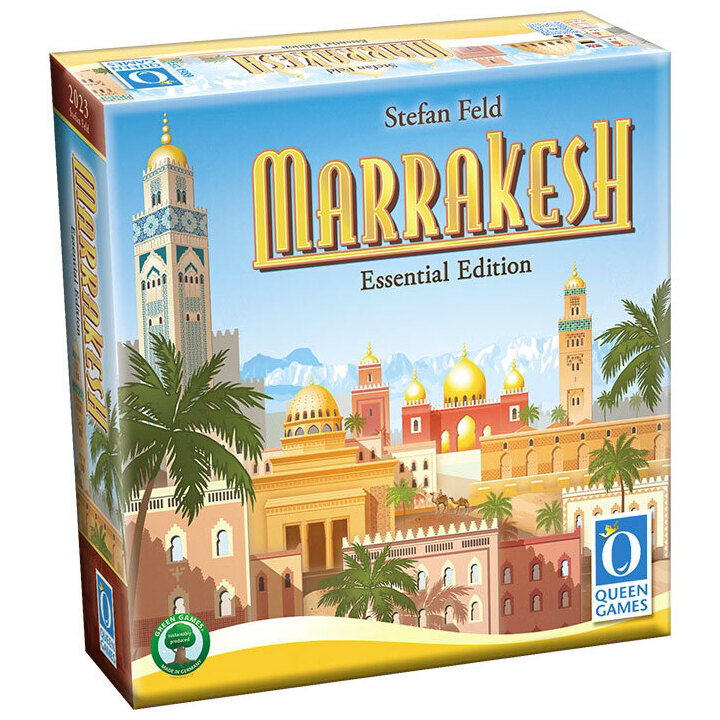 Marrakesh is played over three rounds, with each round consisting of four turns. On each turn, players simultaneously and secretly choose three colored cylinders from behind their screen. Then, in turn order, they place matching colored assistants on their player board (these will be the actions they will perform later), then all cylinders are placed in the cube tower. The cube tower randomizes which cylinders are available this round, with some getting stuck and some from previous rounds coming out.