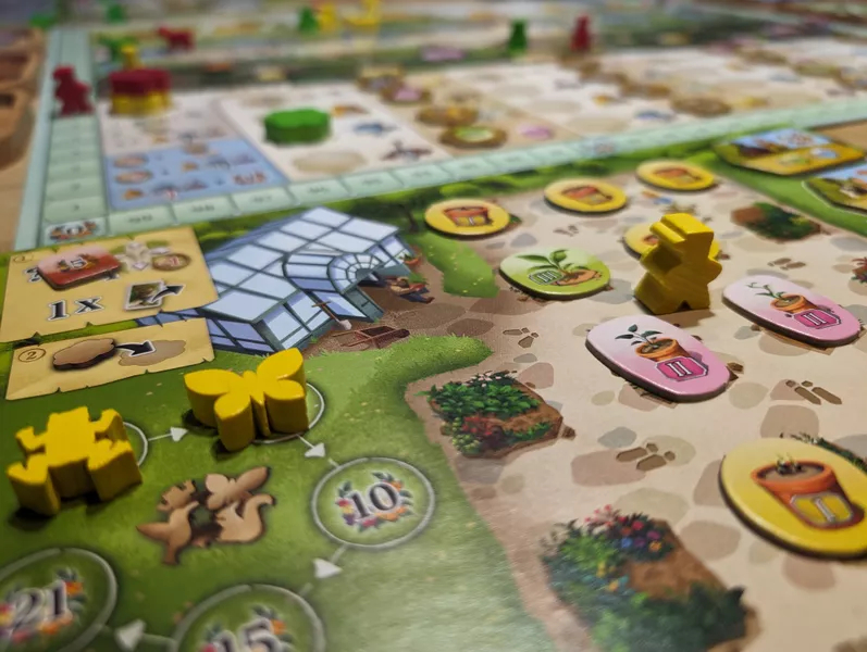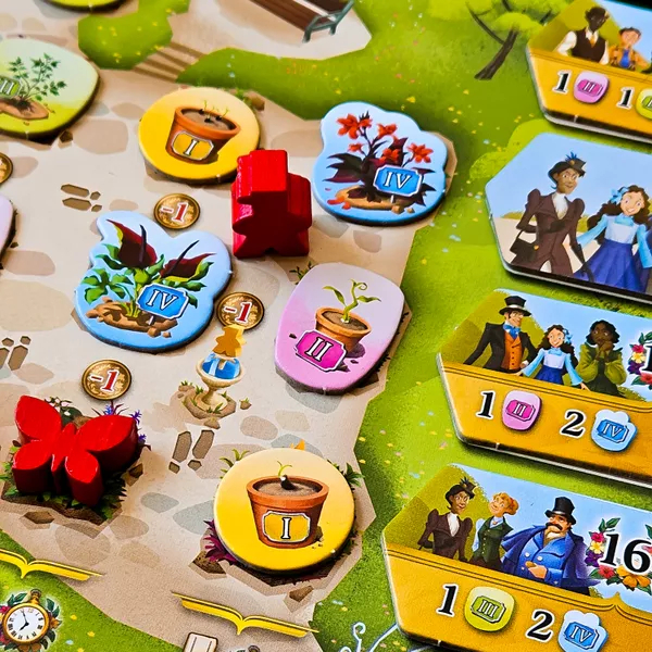 In Botanicus, you compete for the best action-spots in a unique selection mechanism, and then make the most of the options available to you. You have to collect new plants, take care of them, water them and keep an eye on the gardener. Last but not least, you have to collect some money along the way to pay for all this.