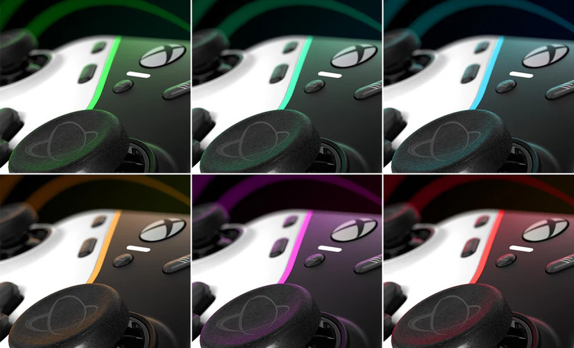 The gamepad features mechanical buttons, which provide quicker responsiveness between the player and the game. With an activation travel of only 0.3 mm, these buttons are significantly faster than conventional membrane-based buttons. The controller is lighter than typical joysticks and includes a customizable central RGB LED that can be set to one of six colors.