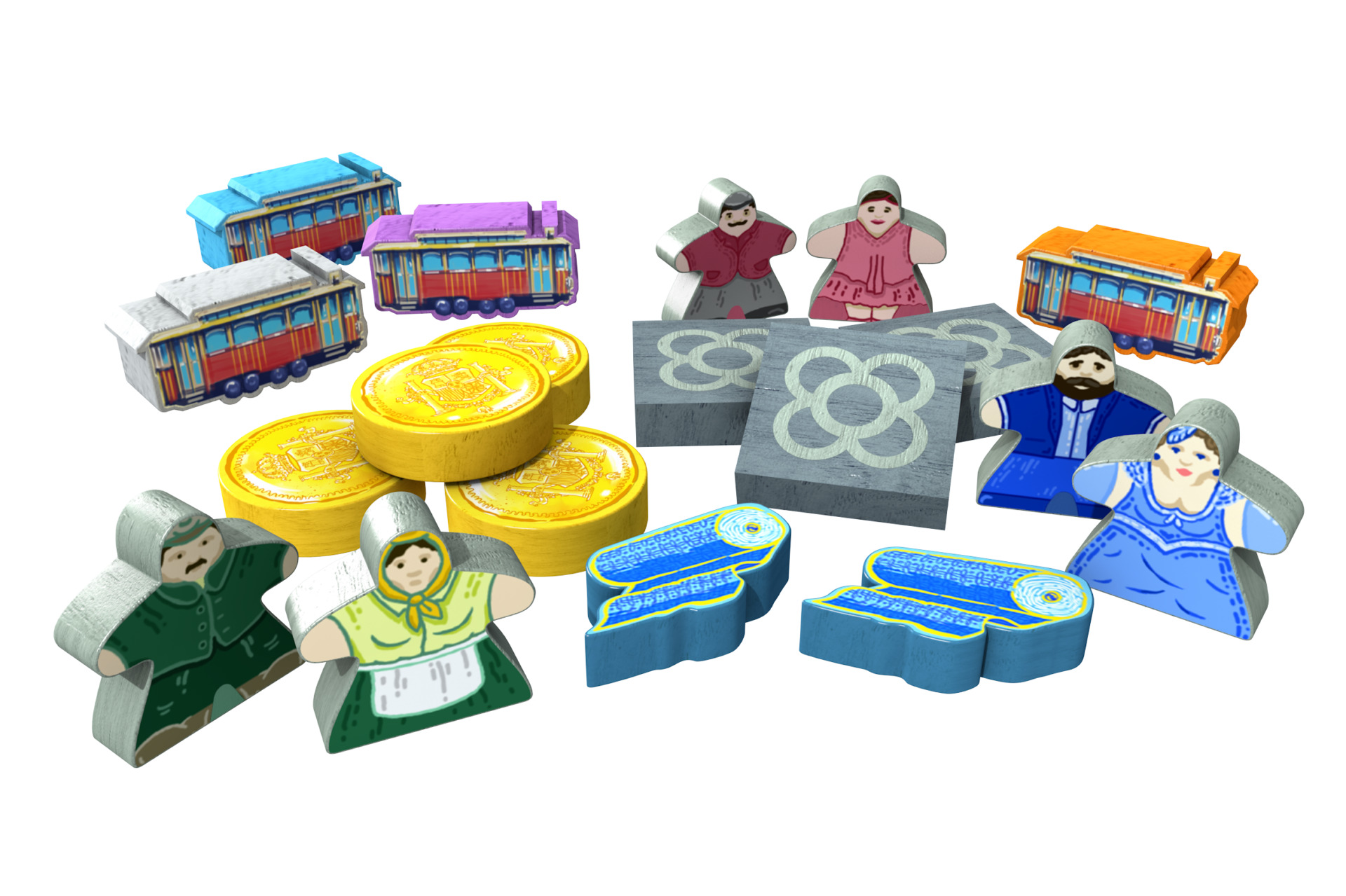 This premium upgrade pack includes 72 Citizen meeples, 60 custom-shaped wooden resources (30 Coins and 30 Cloths, both heat-printed), 4 heat-printed Tram meeples, and 24 engraved Cobblestones. Boost the fun of Barcelona to the top!