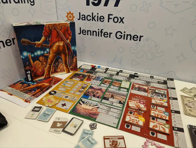 Designed by Jackie Fox (member of the 1970s rock band The Runaways, four-time Jeopardy! champion, and designer of the narrative adventure trilogy The Adventures of the Chubby Slugz) and illustrated by Jennifer Giner, Rock Hard: 1977 allows games for groups of between 2 and 5 players, from 14 years old, in games lasting about 45-90 minutes.