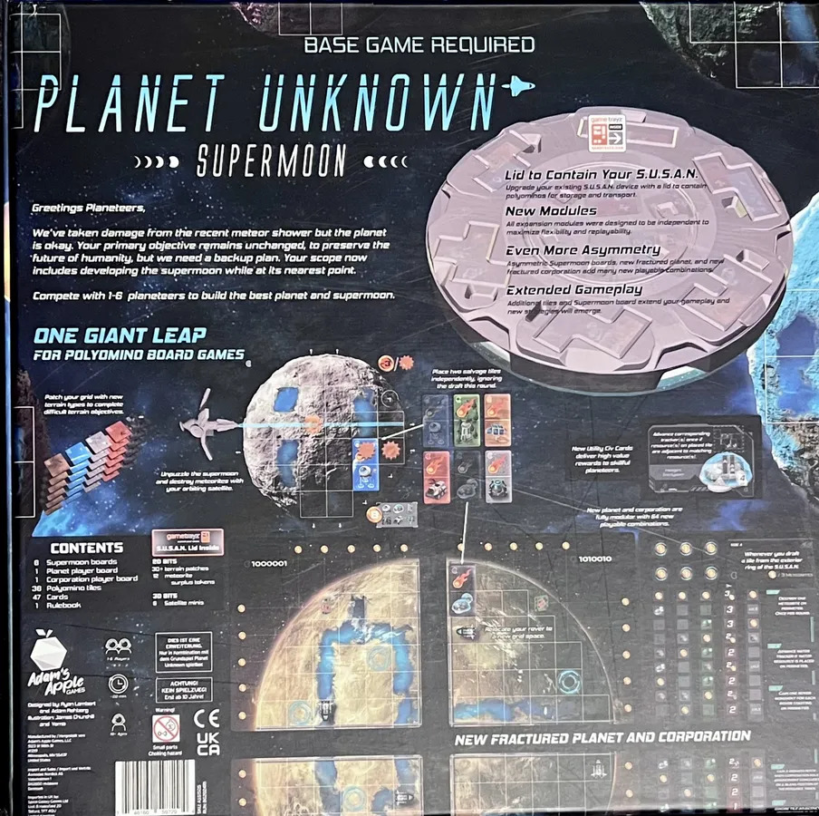 The net effect of the Supermoon expansion will be games that take roughly 5 simultaneous turns longer, extending your gameplay from ~65 minutes to ~80 minutes. This extension allows new strategies to emerge and players must challenge existing assumptions about Planet Unknown retain to their winning edge.
