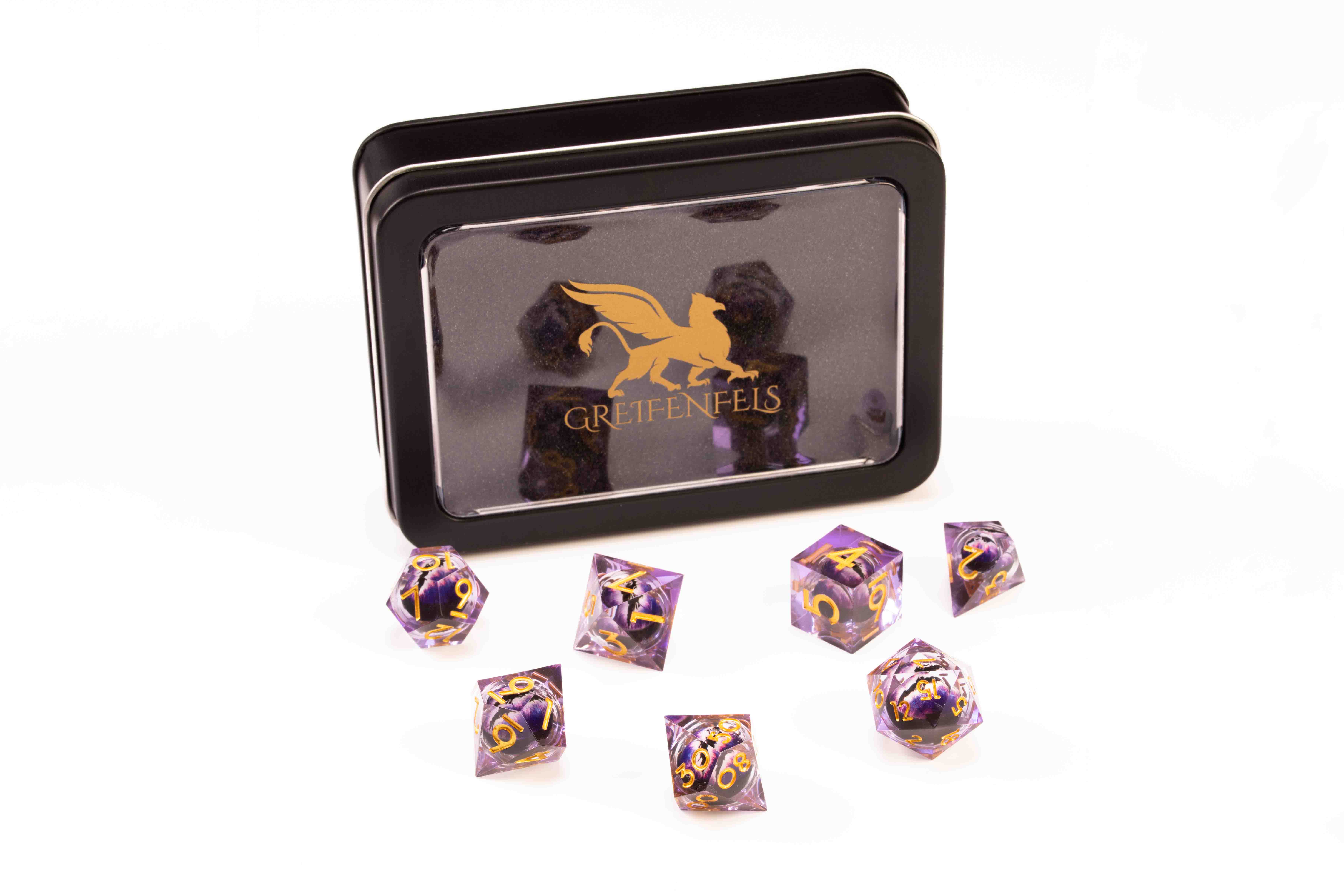 Dessa tärningar från Greifenfels är precisionstärningar med vassa kanter och ett flytande draköga i tärningens kärna (liquid core). Tärningarna är förpackade i en metallask och innehåller sju tärningar: D20, D12, D100, D10, D8, D6, D4. Tillverkade av Resin.