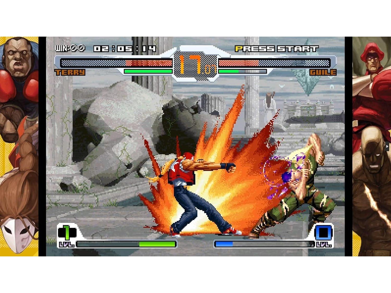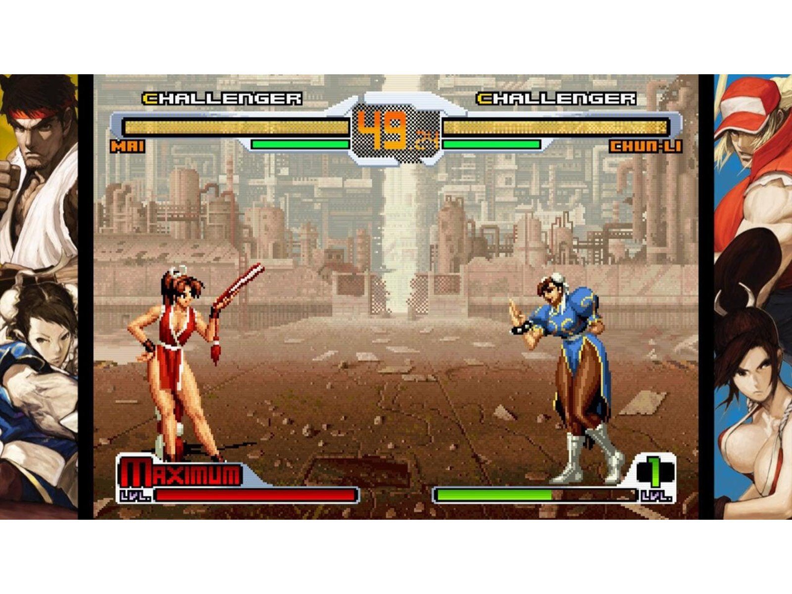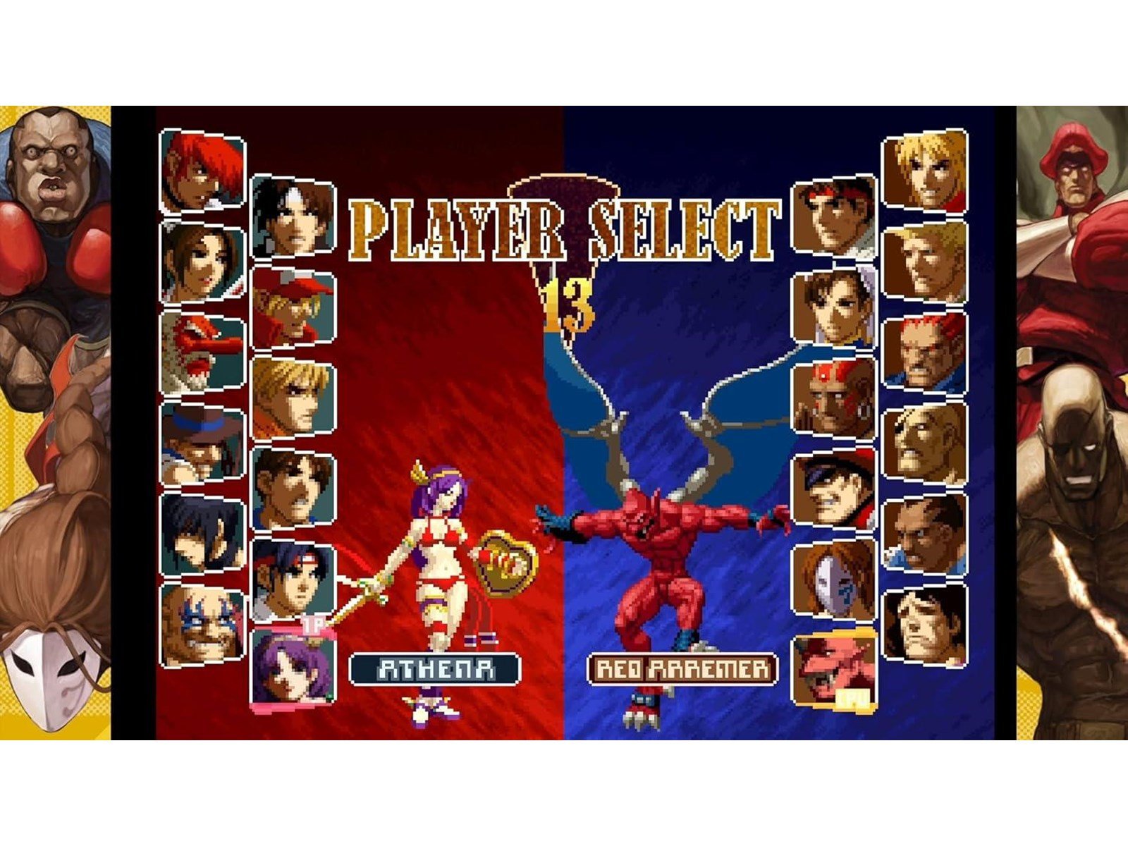 36 characters from SNK and CAPCOM in a battle for the ages! - The SNK cohort sees fighting game staples like Kyo Kusanagi, Terry Bogard, and Mai Shiranui joined by Mars People, Athena, and other SNK icons while battle-hardened CAPCOM combatants such as Ryu, Chun-Li, and Demitri stand tall with Zero, Red Arremer, and more! Play as a total of 36 characters from SNK and CAPCOMs storied legacies!