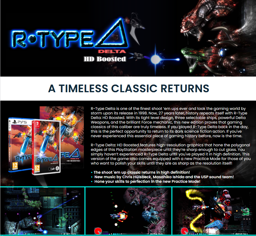 R-Type Delta is one of the finest shoot em ups ever and took the gaming world by storm upon its release in 1998. Now, 27 years later, history repeats itself with R-Type Delta HD Boosted. With its tight level design, three selectable ships, powerful Delta Weapons, and the brilliant Force mechanic, this new edition proves that gaming classics of this caliber are truly timeless. If you played R-Type Delta back in the day, this is the perfect opportunity to return to its dark science fiction action. If youve never experienced this essential piece of gaming history before, now is the time.
