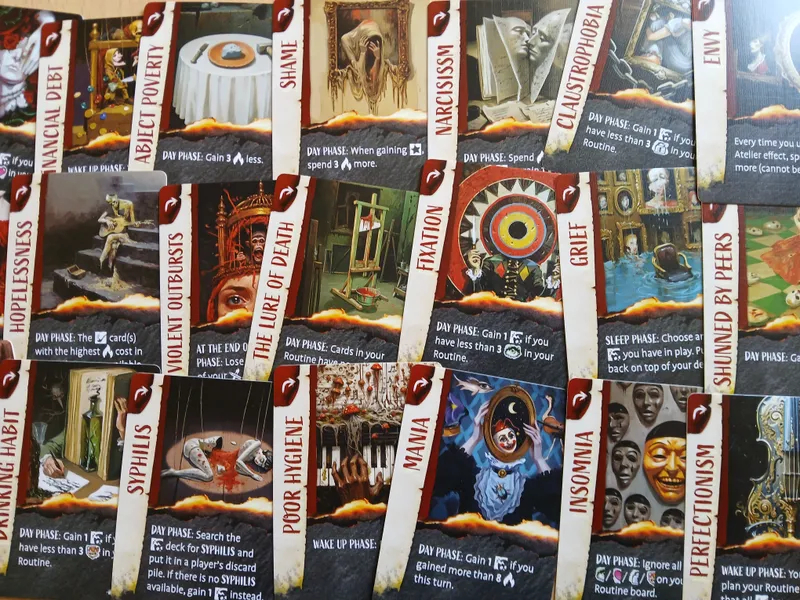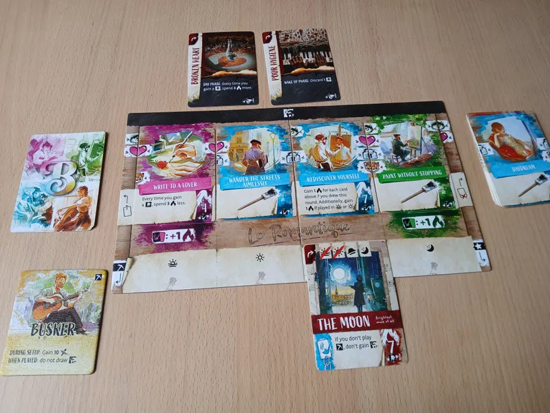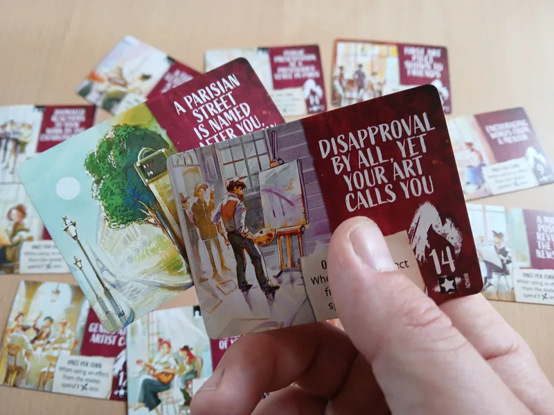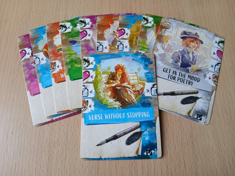 In each round, players must plan that days routine and decide whether they will go on a date, participate in a social event, meet their muse, create new art, or...go to work. Each card offers them various bonuses and inspiration, so carefully managing your card supply and the order in which theyre played is crucial to getting the most inspiration. Players then spend their inspiration to purchase cards and build their deck with new habits, inspiring muses, or new achievements in their career. The artist who acquires the most achievements from the achievements deck wins.