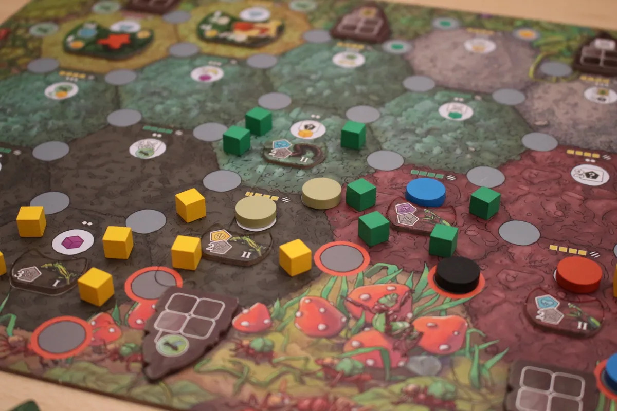 An important part of the game is managing your nests architectural growth. Room tiles must be placed strategically to complete entire nest areas, immediately rewarding you with precious stars, one of the primary victory point sources. The garden map becomes a dynamic battlefield where your exploration reveals enemy tiles and resources, while gatherer ants create supply chains that automatically collect resources and emit pheromones when hexes are depleted.