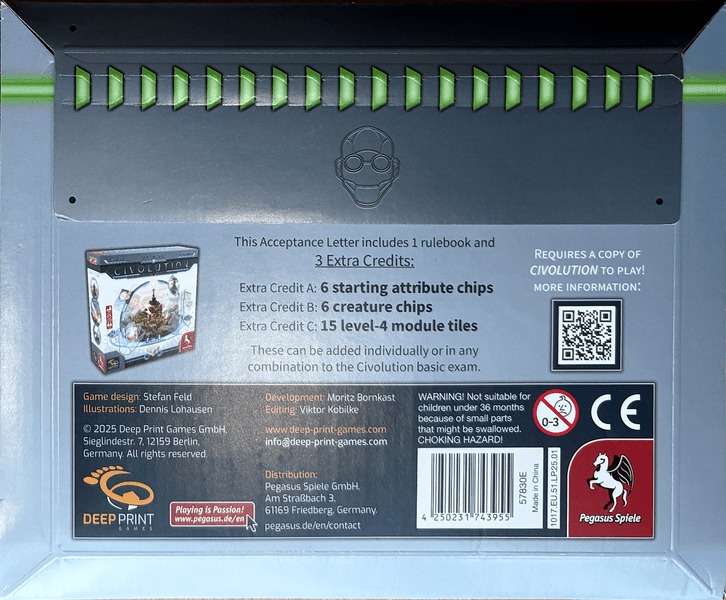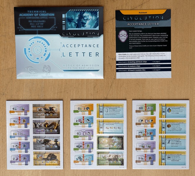 Civolution: Acceptance Letter is a small expansion pack for Civolution that features 3 Extra Credits. Extra Credits are small add-ons that can be used with the base game either individually or mixed together.