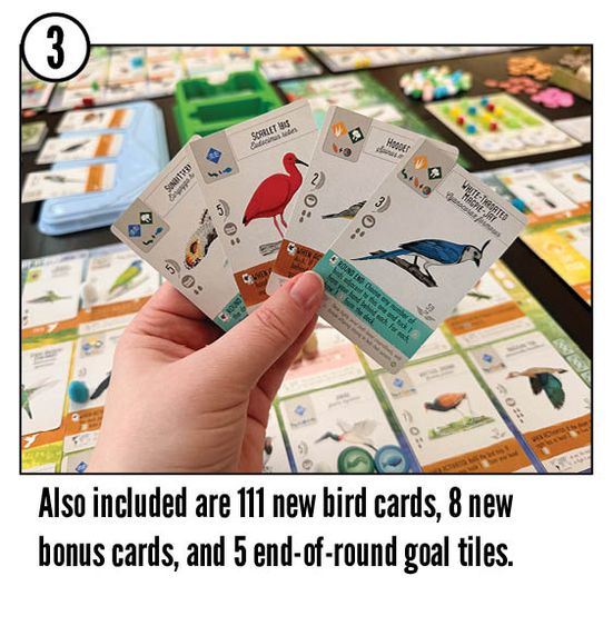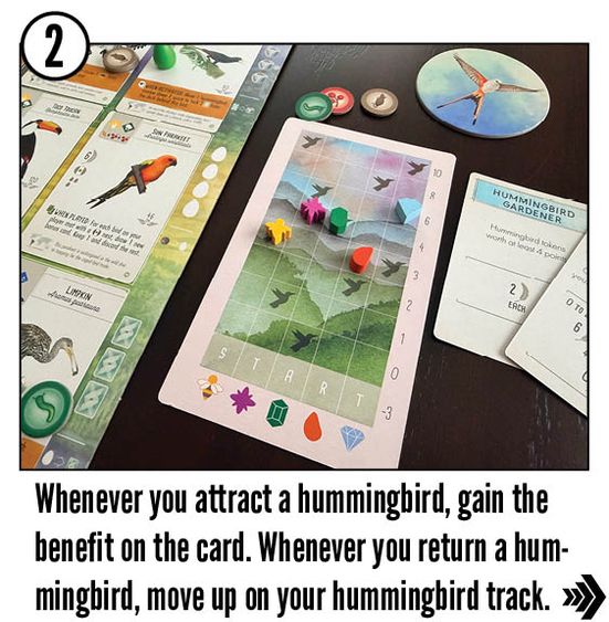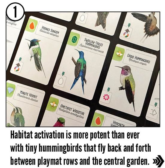 Hummingbirds make up about one tenth of the bird species in Latin America, delighting birders with their quick movements and shimmering feathers. Designer Elizabeth Hargrave and artists Natalia Rojas, Ana Maria Martinez Jaramillo, and Martha Clare highlight them in this expansion with a new type of card that adds a twist to gameplay.