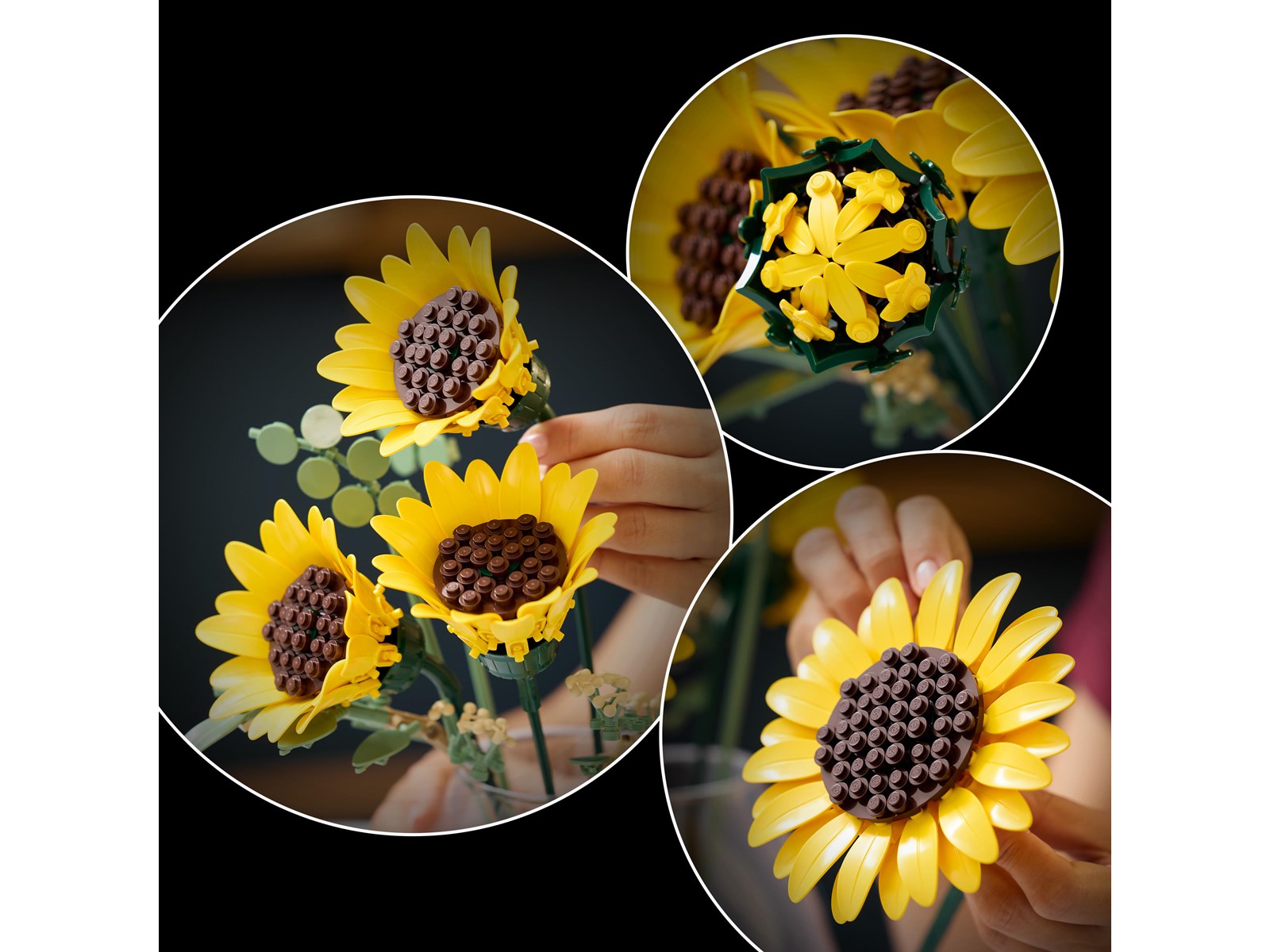 Var kreativ och skapa en härlig blomsterprydnad med byggsetet LEGO® Botanicals Bukett med solrosor för vuxna. Skapa 1 solrosknopp, 3 solrosor som börjat blomma och 2 stora, fullt öppna solrosor, plus 4 stjälkar med eukalyptusblad, innan du arrangerar LEGO växterna till en skräddarsydd bukett. När den är klar kan du stolt visa upp den eller ge bort den som en omtänksam present.