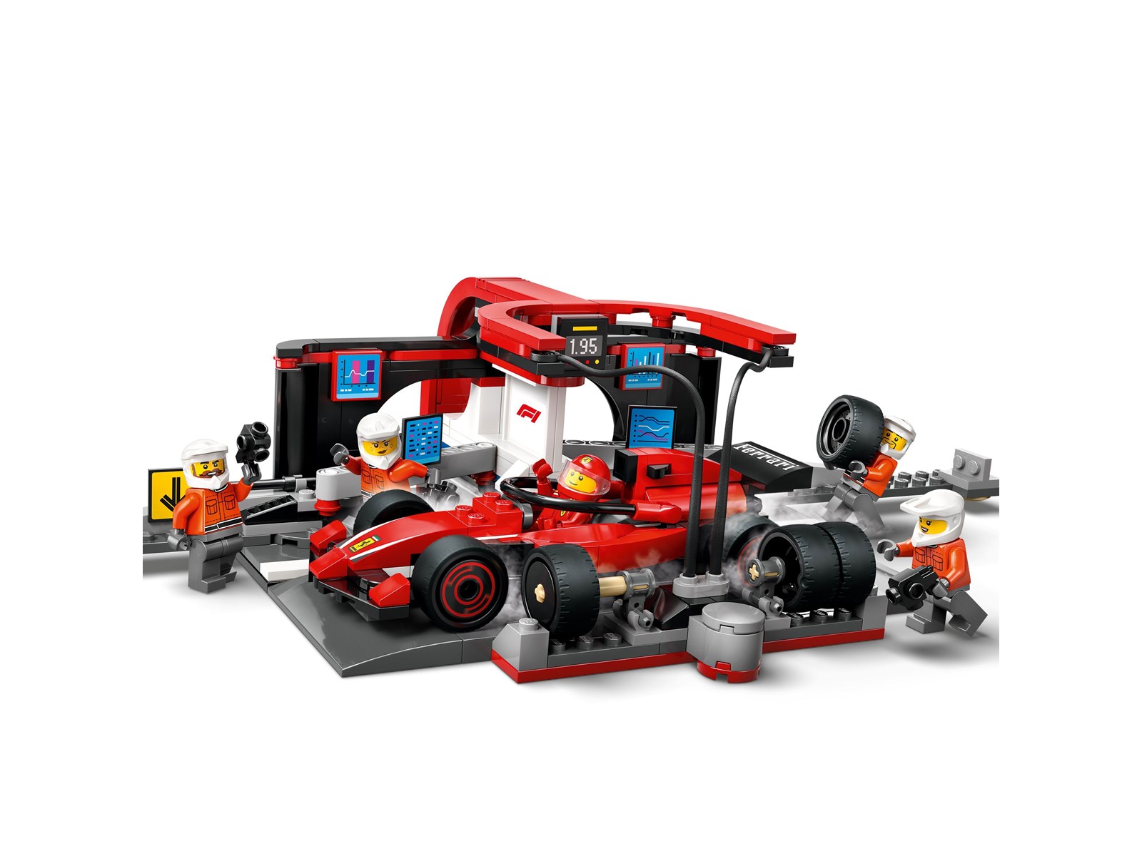 Set med F1® depåstopp och en Ferrarileksaksbil, plus minifigurer av en förare och 4 depåarbetare