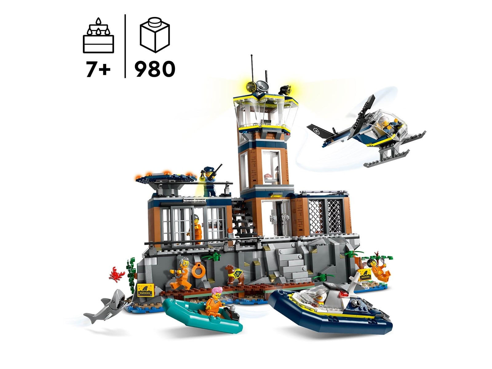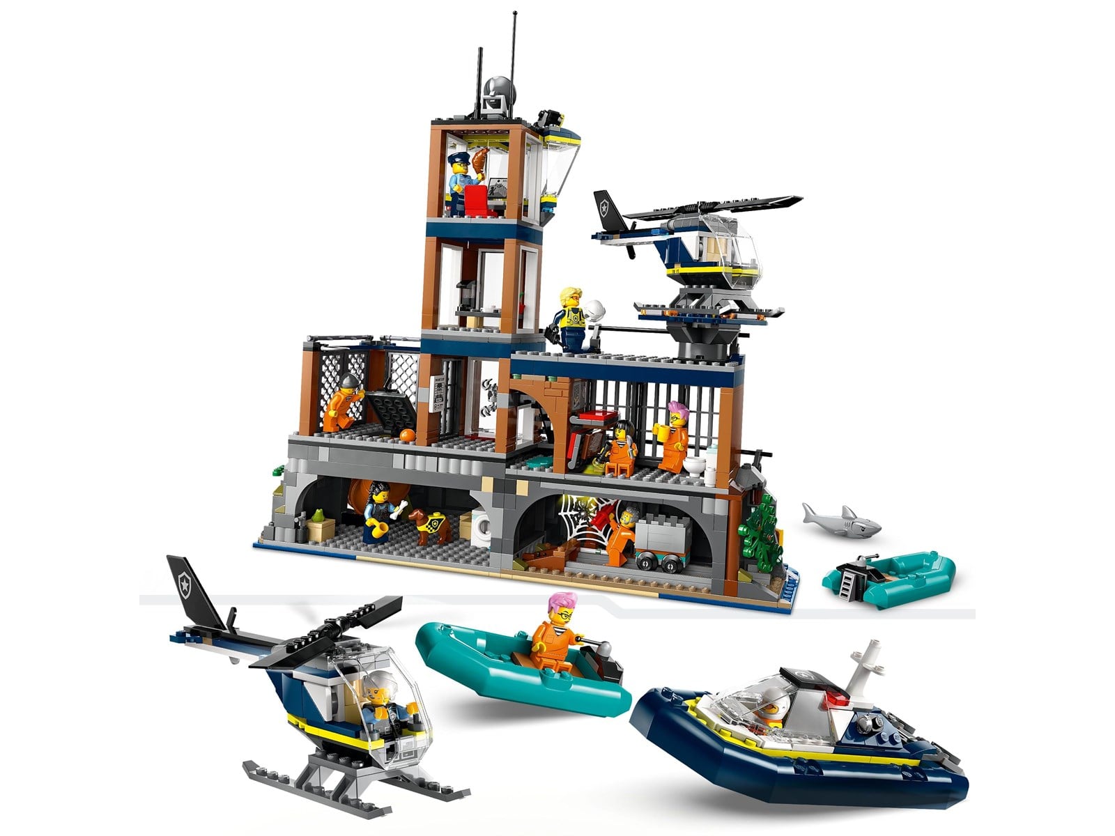 Leksaksfängelse med båt, jolle, helikopter, 7 minifigurer och 2 djurfigurer