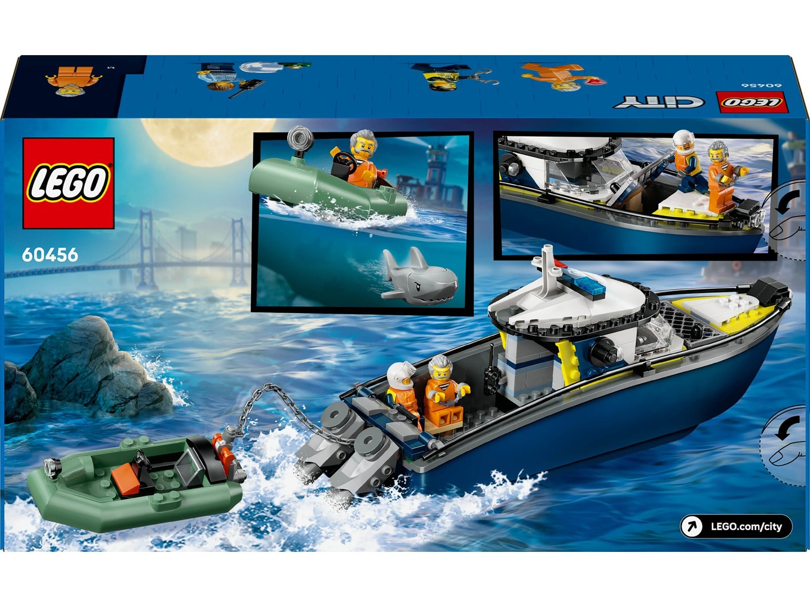 Innehåller en leksakspolisbåt och en motorjolle, 3 minifigurer och en hajfigur