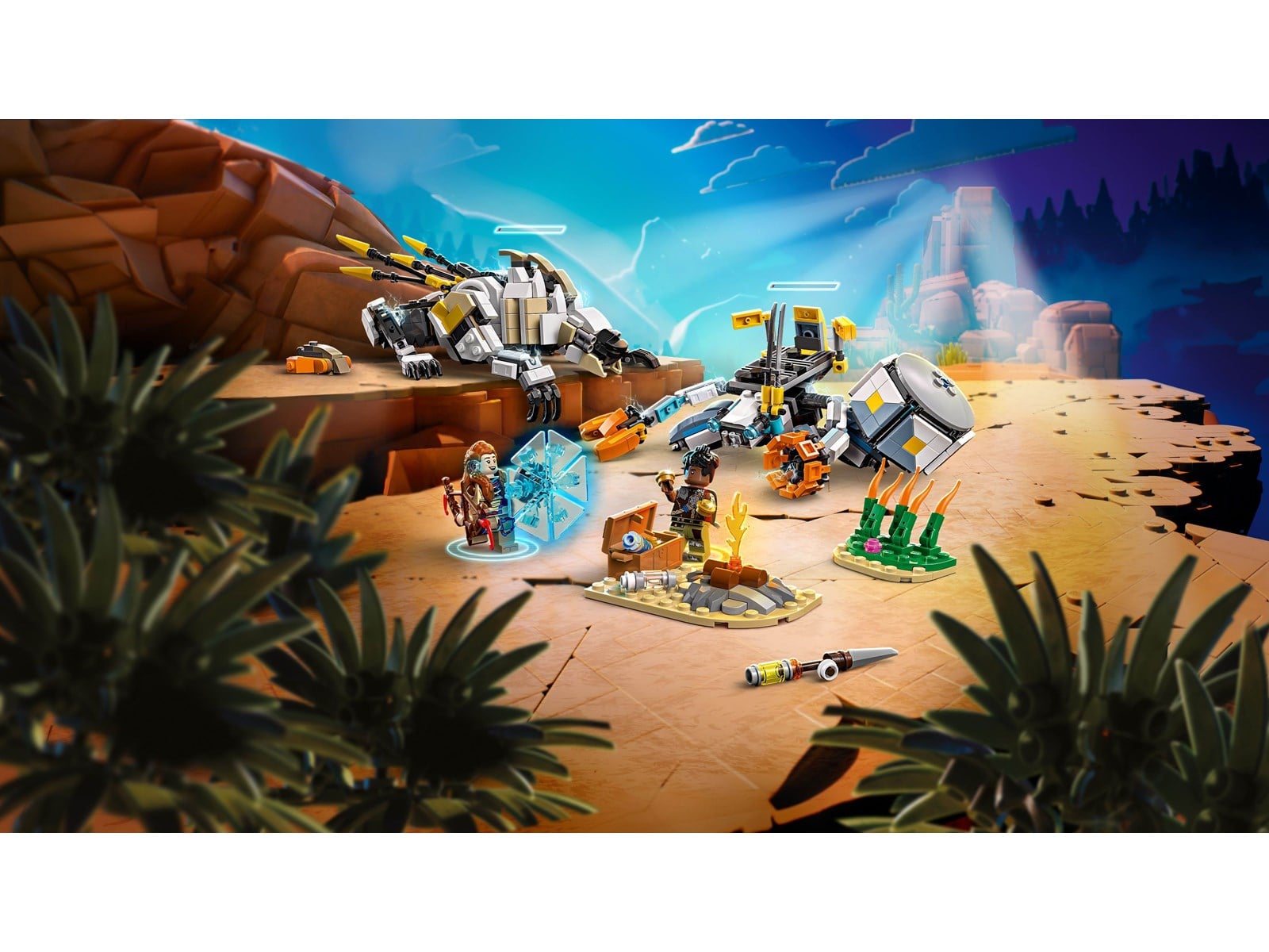 Aloy och Varl kämpar mot 2 maskinmonster i denna LEGO® äventyrsleksak