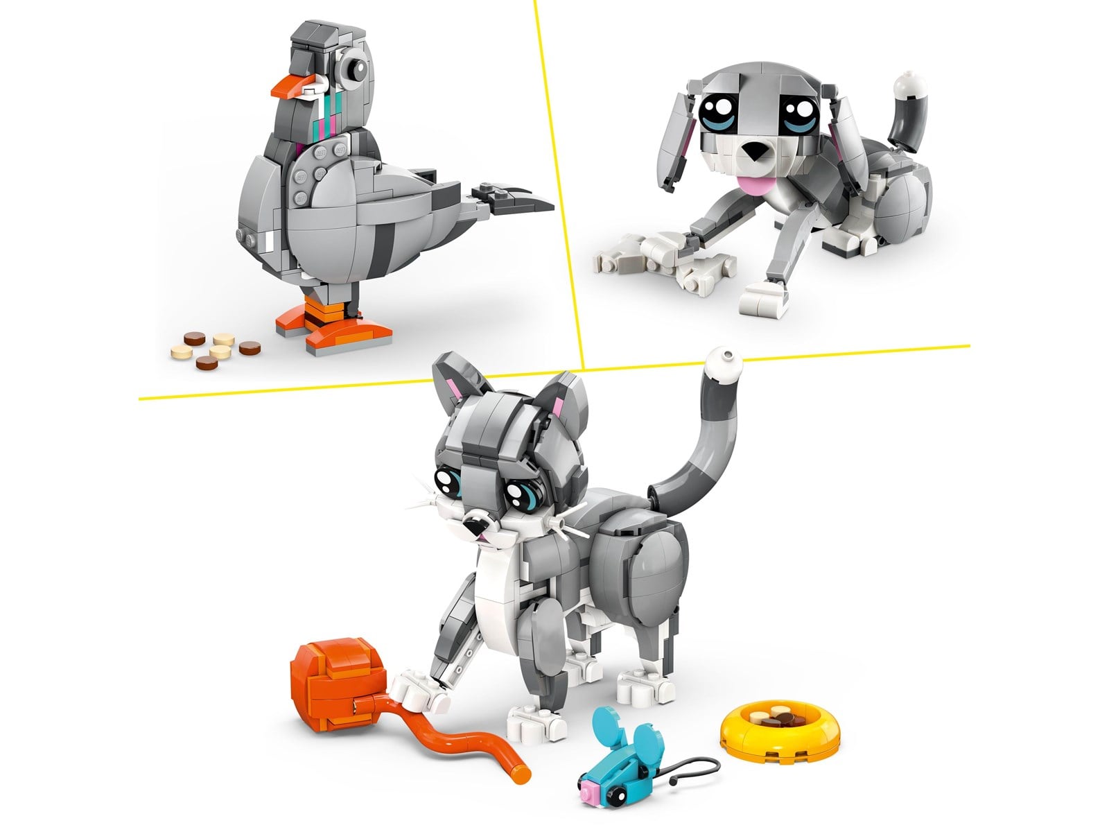 Iscensätt berättelser med 3 husdjur: en lekfull katt, en glad hund och en nyfiken duva