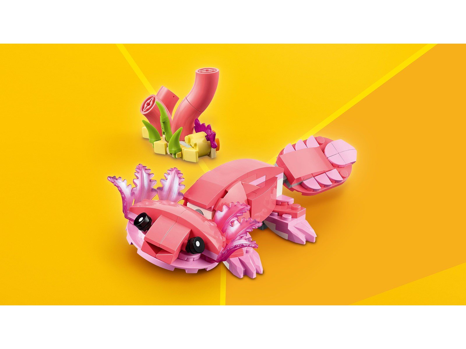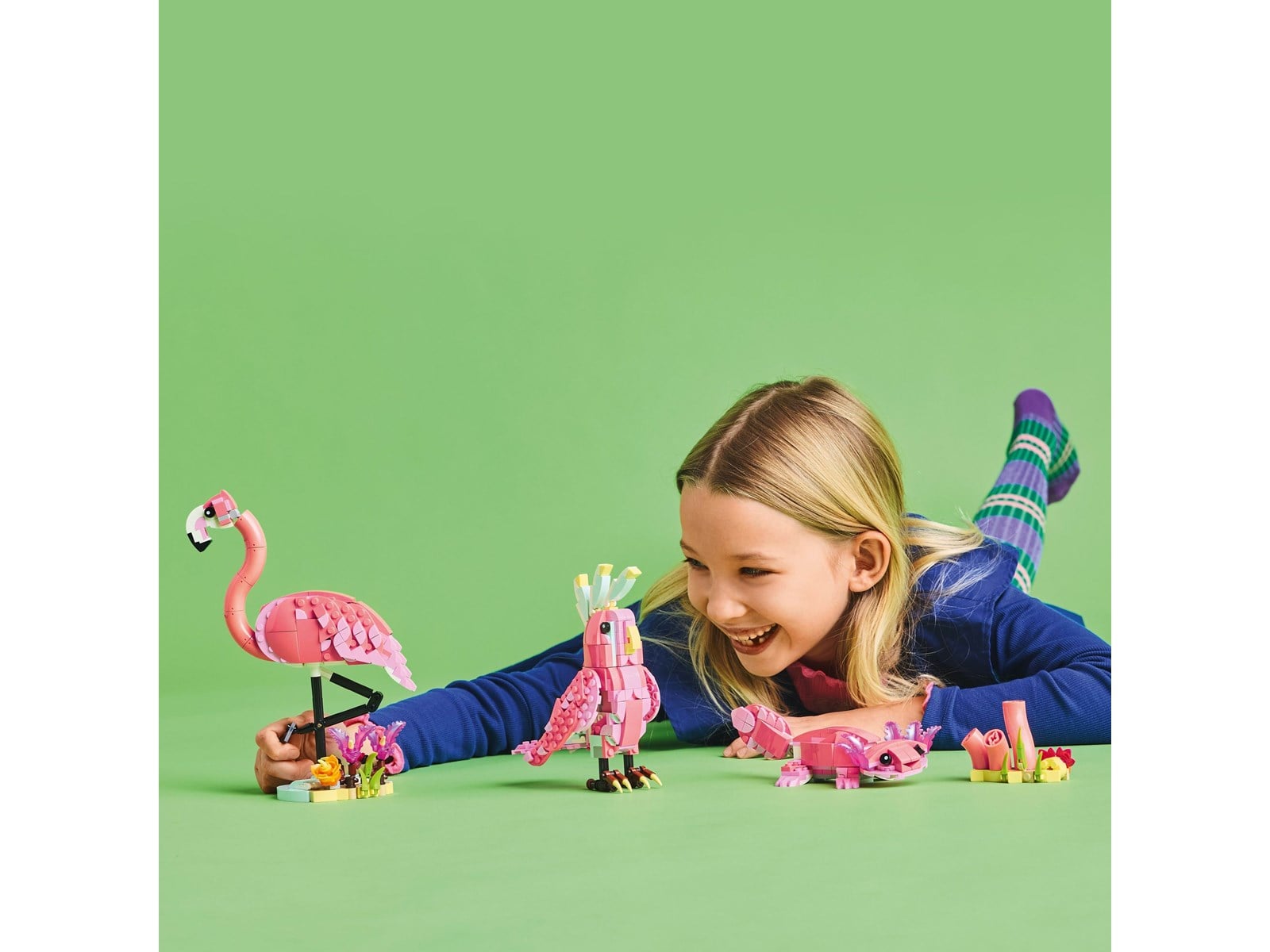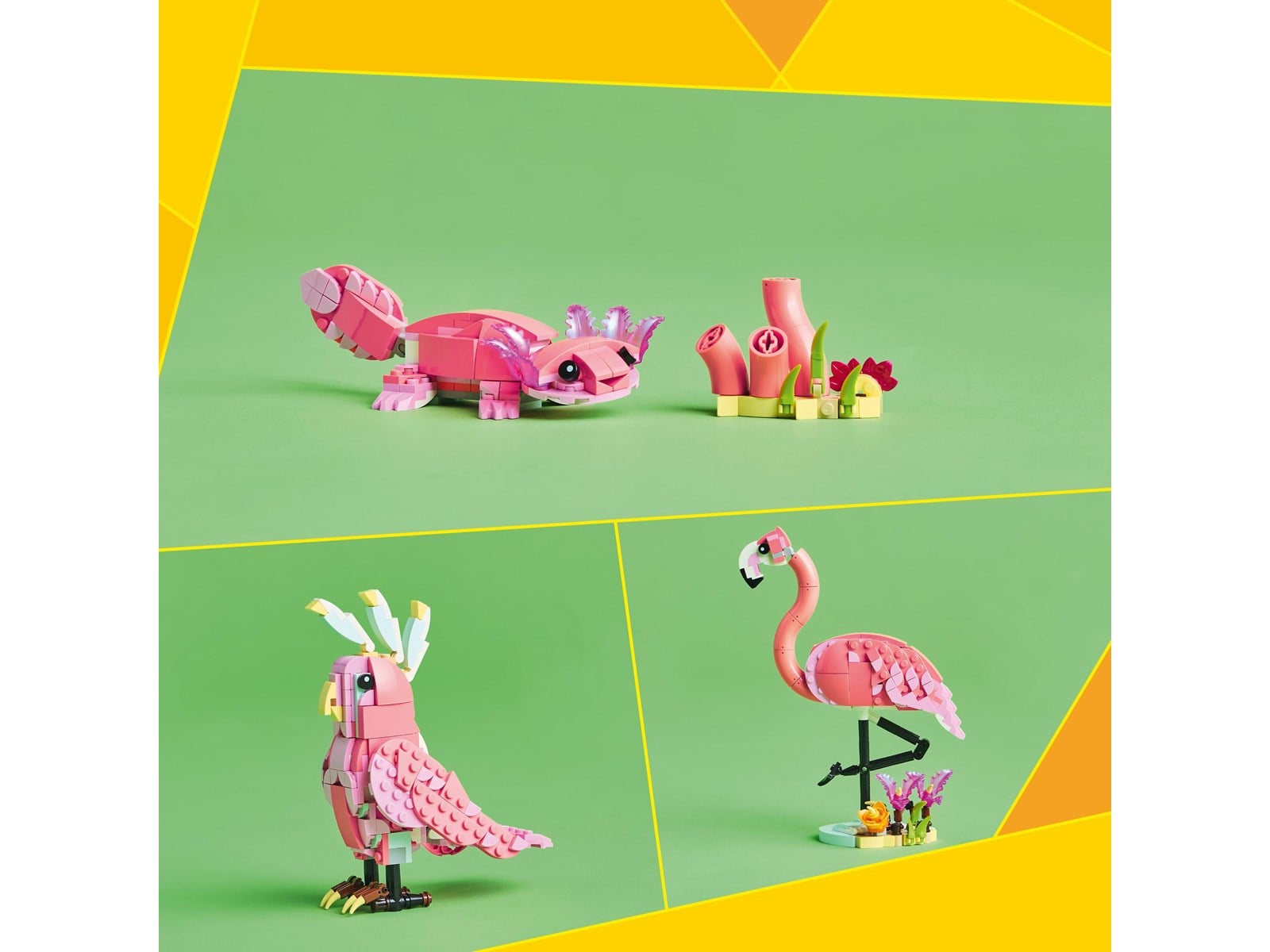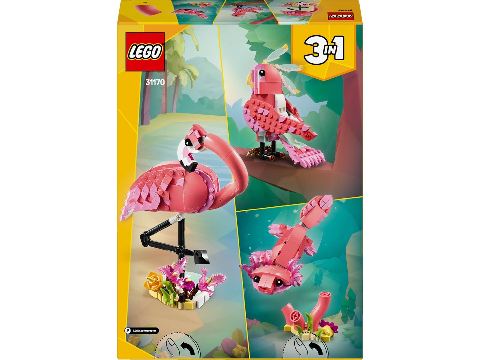 Ta med skönheten och färgen från en tropisk ö till ditt rum med dessa 3 fantastiska vilda djur! Se hur en graciös rosa flamingo står på en växtfylld flodbank innan den dricker lite vatten. För ännu mer rolig djuraction, bygg om den till en vacker kakadua, som kan vrida huvudet hela vägen runt, eller en bedårande axolotl. Vad ska du bygga Valet är ditt med detta roliga 3-i-1-set.