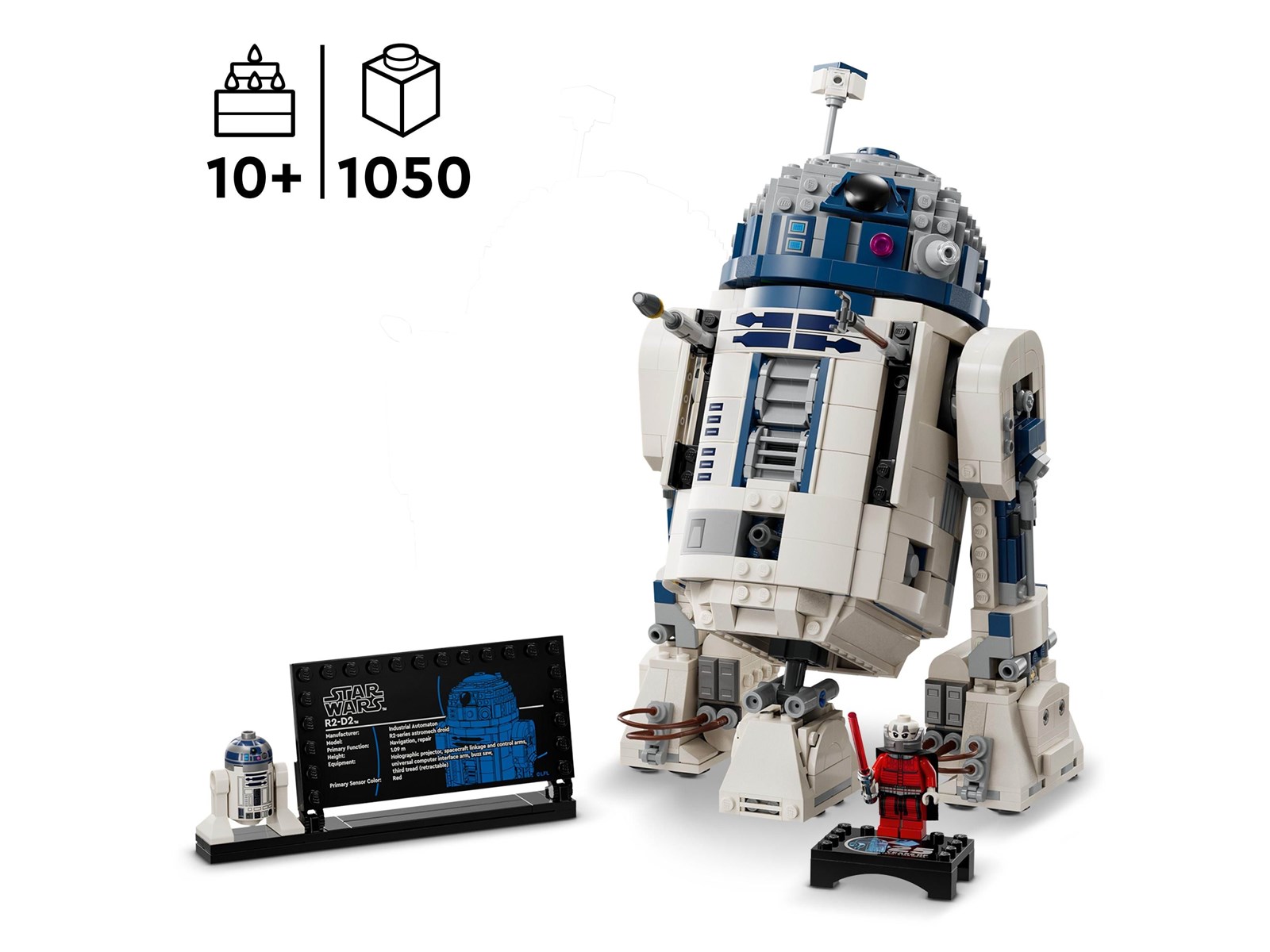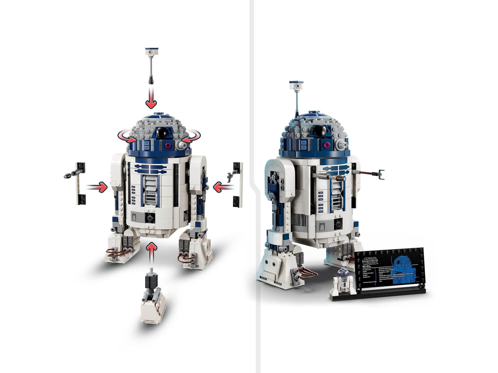 En LEGO® droidfigur av R2-D2 och en informationsskylt om R2-D2