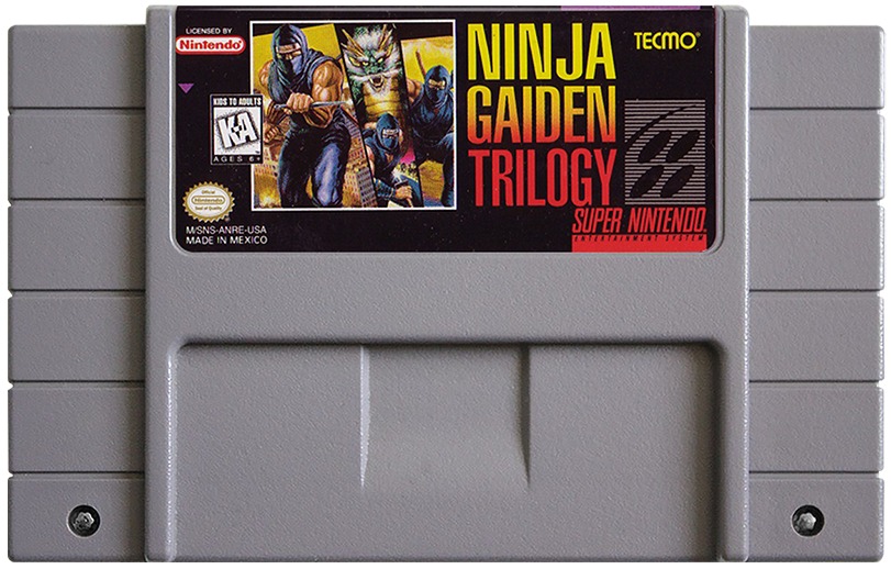 Ninja Gaiden Trilogy is a 1995 SNES collection featuring all three Ninja Gaiden games. Few improvements were made, but passwords were included and the cinematic sequences were improved. The graphics were retouched and the soundtrack was updated.